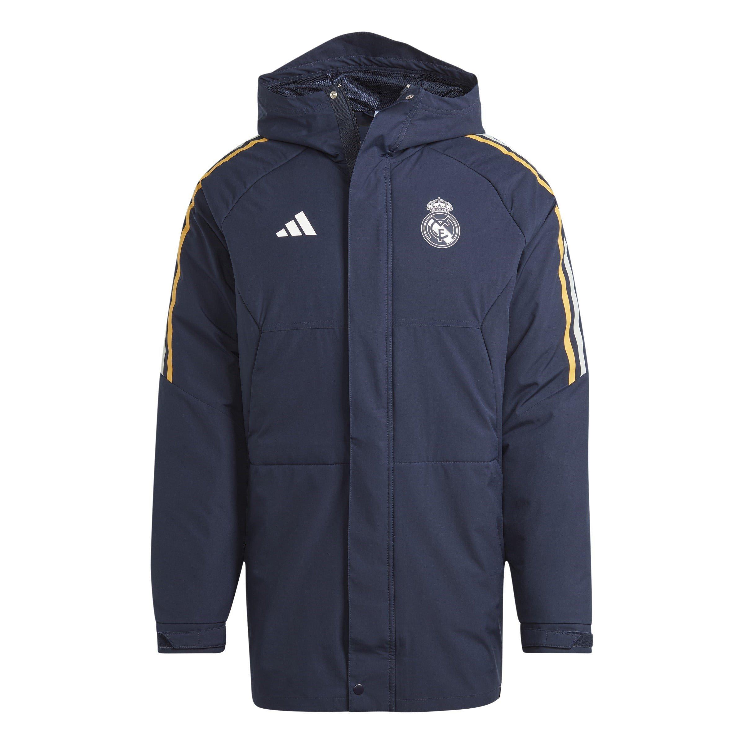 Dompel jezelf onder in de geest van voetbal met de Real Madrid Condivo 23 Stadium Parka van adidas. Compleet met het kenmerkende trefoil-logo en het iconische teamembleem op de borst, toont het je liefde en steun voor het spel. Van drukke stadions tot juichen vanaf de zijlijn, deze parka is je trouwe metgezel tijdens elke voetbalreis.