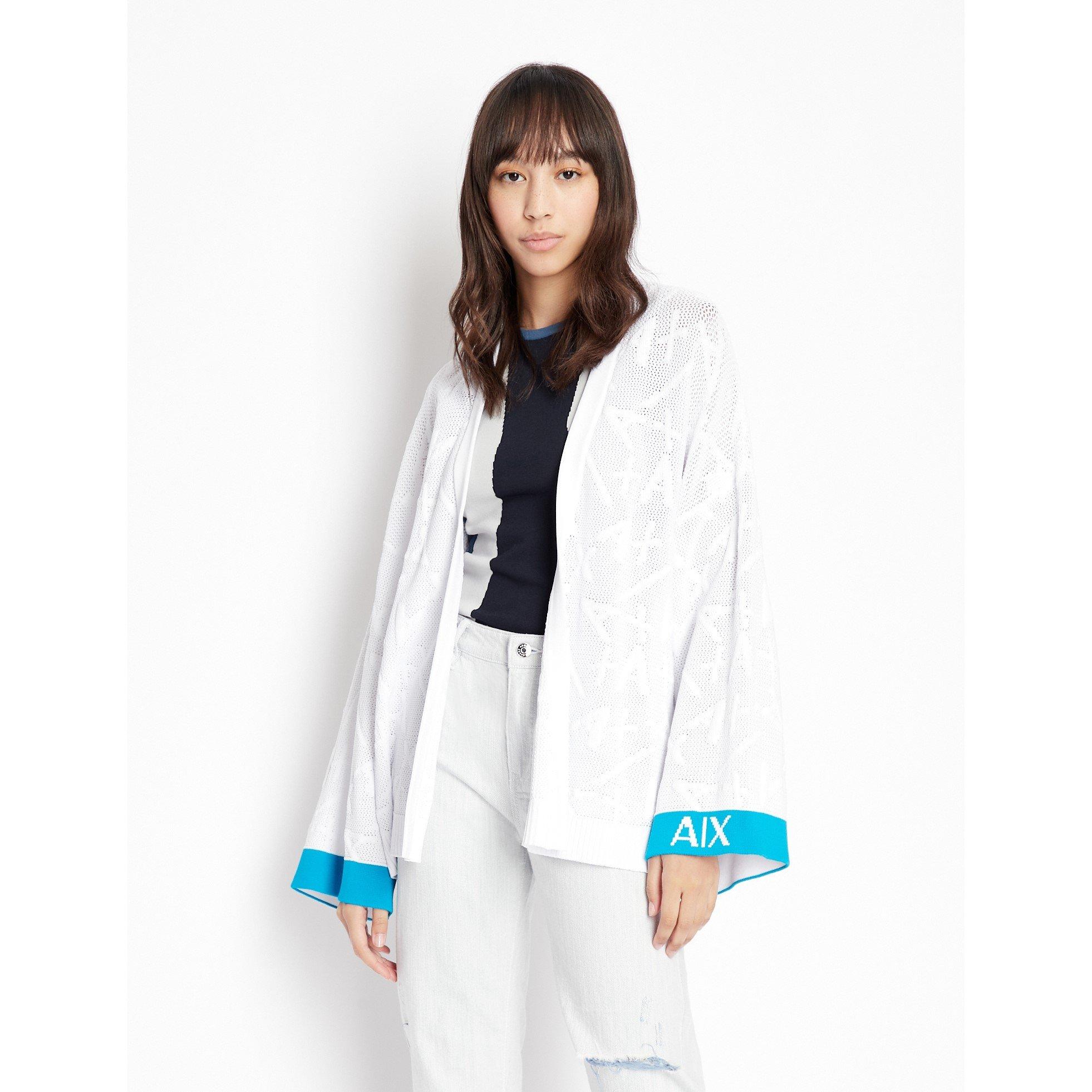 Gedefinieerd door zijn vloeiende kimono-stijl, brengt de Armani Exchange Logo Kimono Cardigan een ontspannen stijl naar gelaagde looks. Logo-details voegen herkenning van het merk toe.
