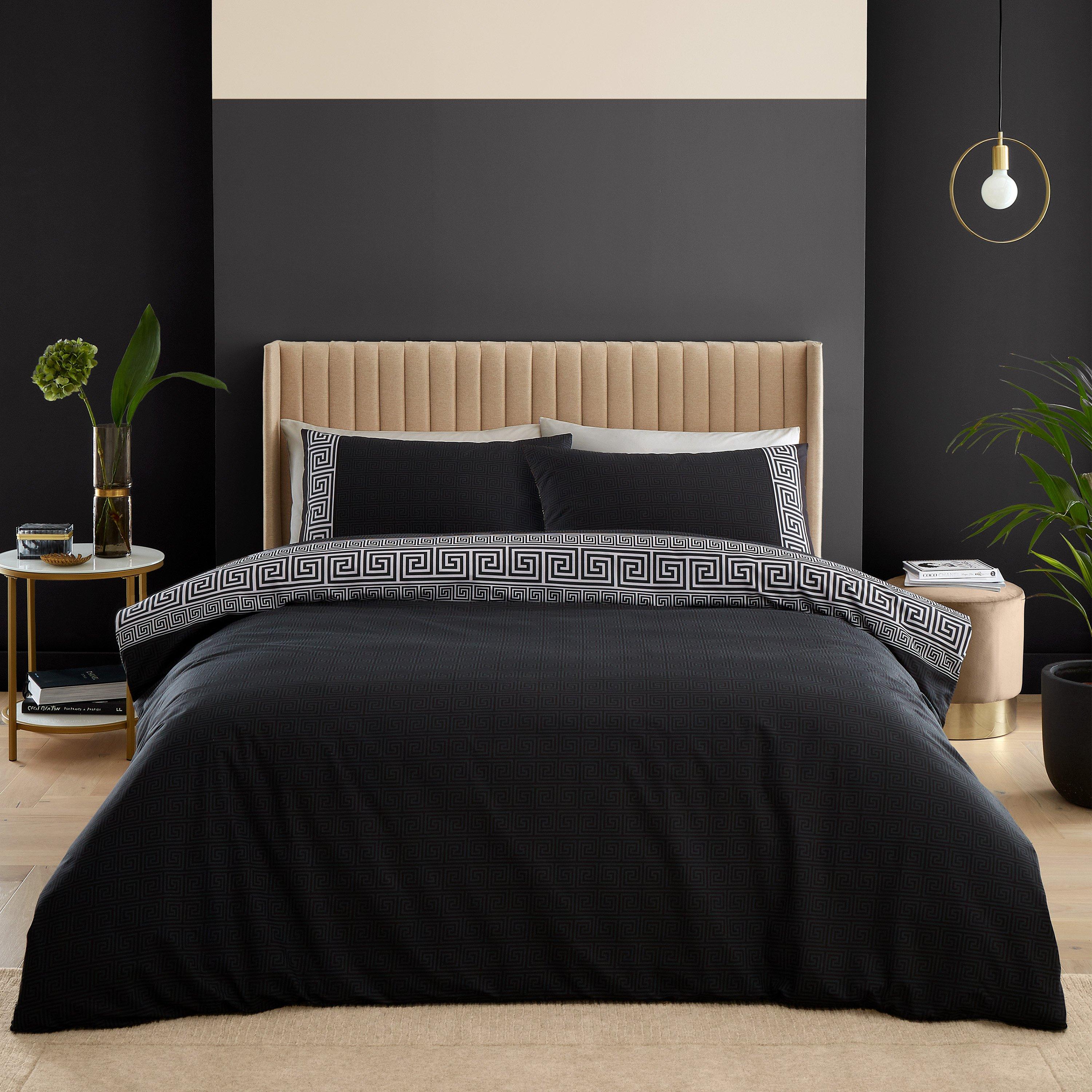 Maak een statement in je slaapkamer met dit tijdloze lineaire Griekse sleutelmotief beddengoed. Het stijlvolle herhalende patroon, gekleurd in een contrasterend grijs, staat centraal tegen een dramatische zwarte achtergrond. Volledig omkeerbaar met een herhaald geometrisch sleutelmotief en gemaakt van gerecycled polyester en zacht verantwoord verkregen katoen, samengevoegd voor dagelijks gebruik.