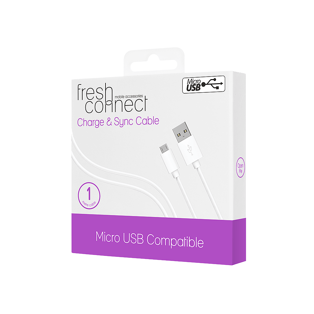 Laad je mobiele apparaat of tablet op met deze essentiële dagelijkse 1m Micro USB-oplaad- en synchronisatiekabel van Fresh Connect in het wit.