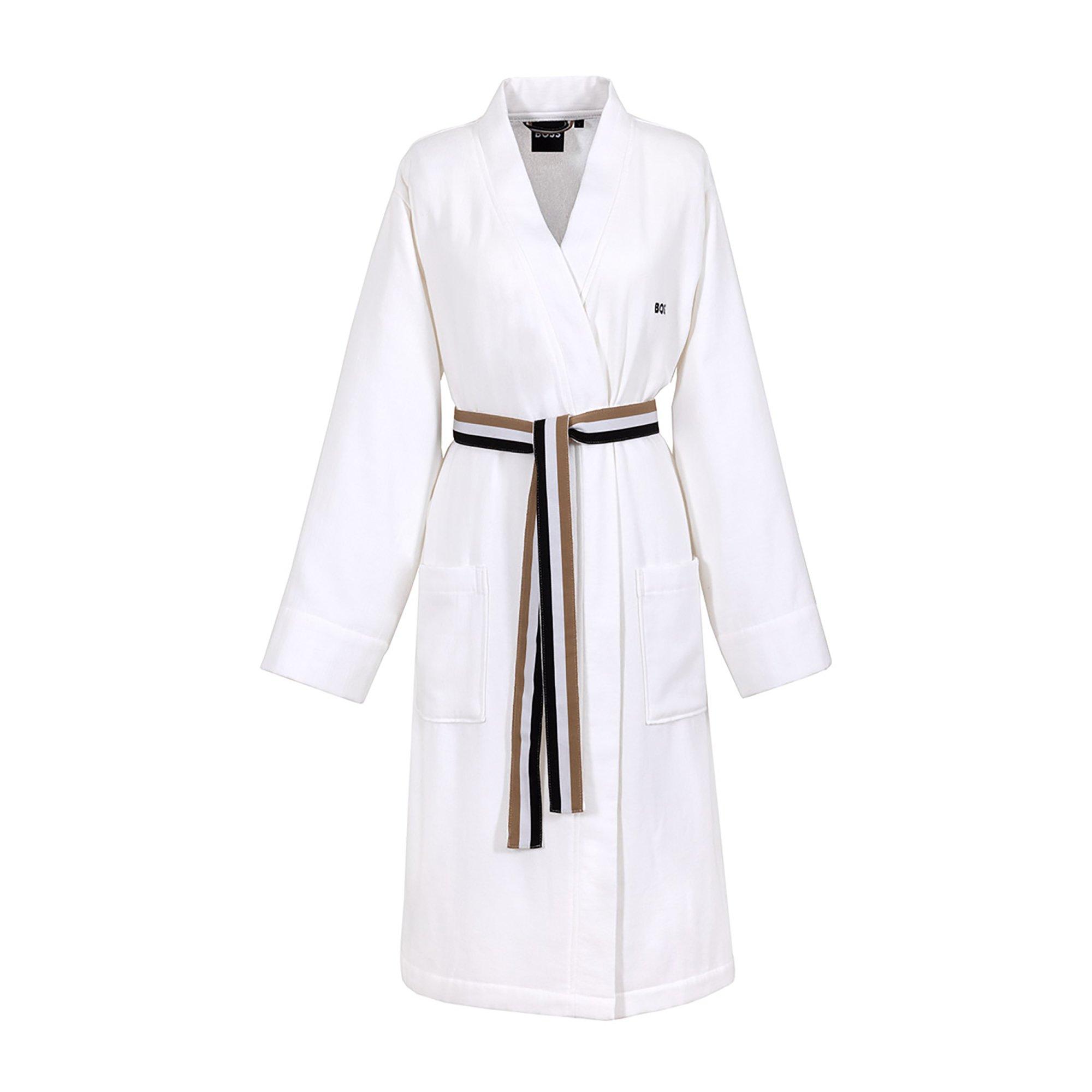 Een onderscheidende gestreepte riem in neutrale tinten voegt een modern designelement toe terwijl de badjas perfect op de taille wordt vastgezet.