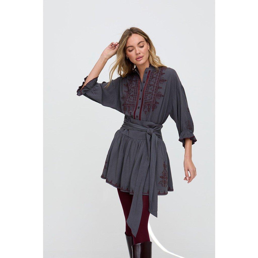 De Julie mini rok is een speelse maar verfijnde basis. In diep grijs is het afgewerkt met een delicaat geborduurde zoom en een strikdetail aan de voorkant, terwijl de elastische achterkant zorgt voor comfort de hele dag. Volledig gevoerd voor een moeiteloze pasvorm en gevoel.