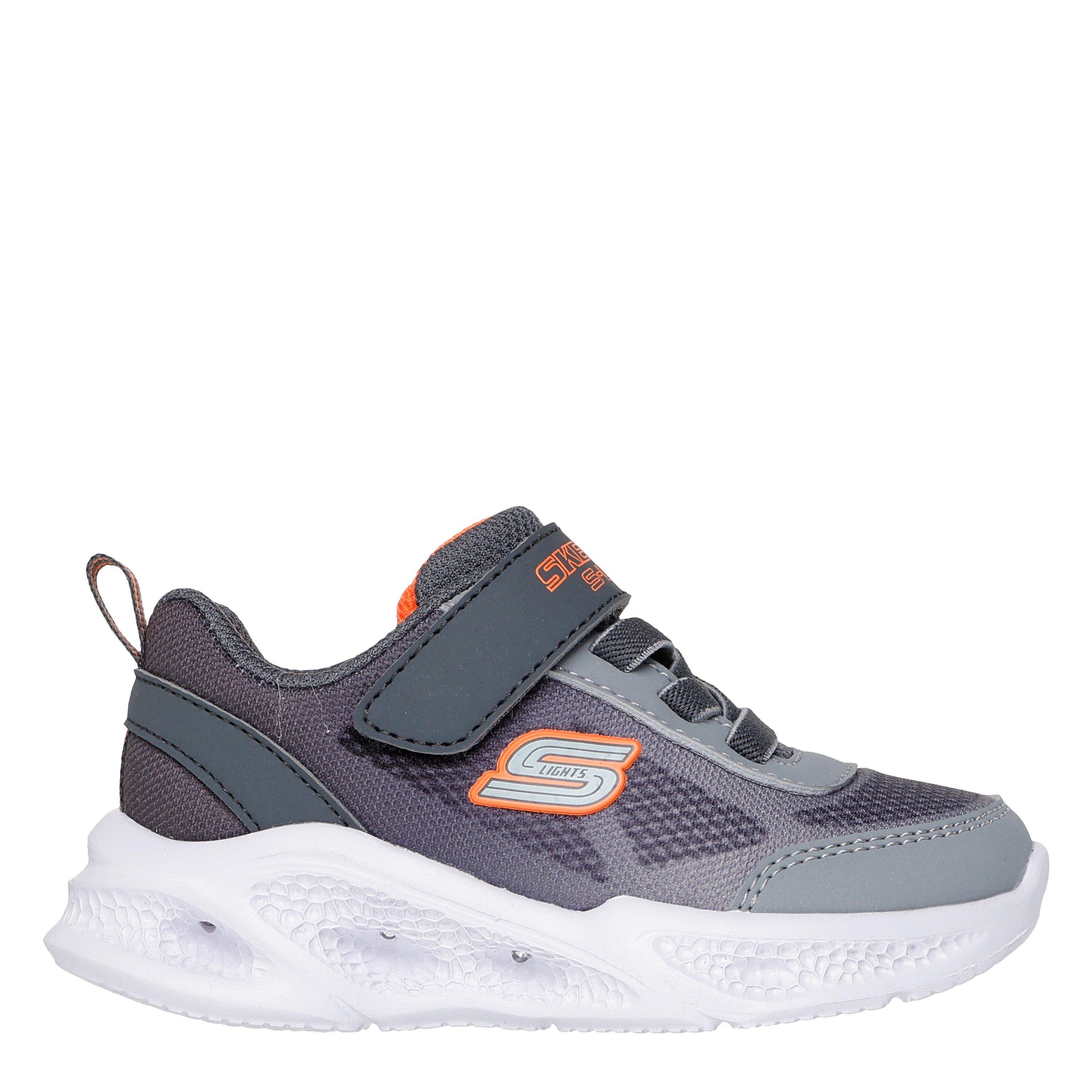 Skechers' Kids' Gore en Strap Leren Lichtgevende Sneakers hebben een gemakkelijk toegankelijke ontwerp met een verlichte zool. Een klittenbandsluiting gaat samen met een rekbare gore-paneel voor een veilige, verstelbare pasvorm.