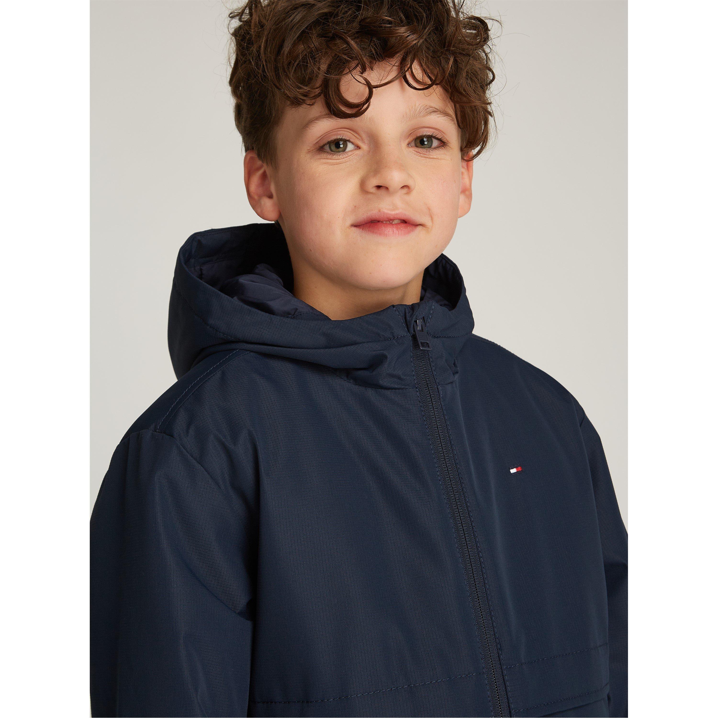 De Tommy Hilfiger Kids' Ripstop Gewatteerde Hooded Softshell Jacket is ontworpen om dagelijks gebruik aan te kunnen. De gewatteerde constructie houdt warmte vast zonder extra volume toe te voegen.